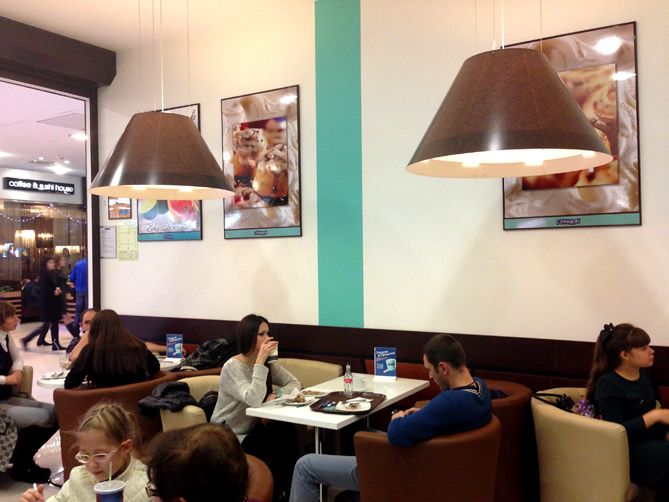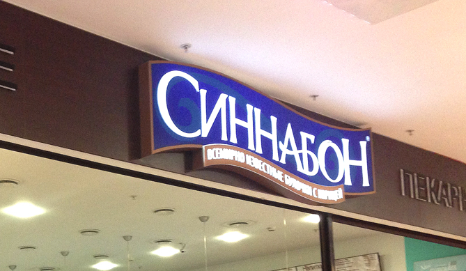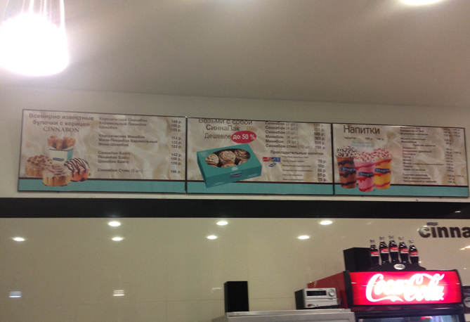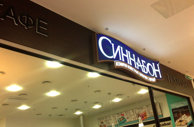 Световая реклама в Краснодаре, фигурные световые короба изготавливает компания Знак. Так же изготовим светильники с логотипом, меню в виде постеров, световое, несветовое, интерьерные постеры в багете, тейбл тенты и многую другую рекламную и сувенирную продукцию. 2010 г., кафе "Синнабон", ТРК "Галерея" Краснодар.
